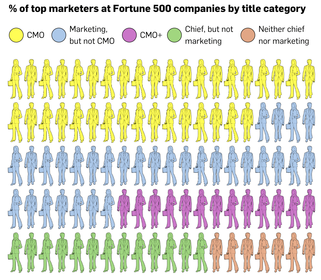 Spencer Stuart 发现财富 500 强公司的许多顶级营销人员的头衔中根本没有营销一词。 一些承担营销职责而不是首席营销官的高管包括首席营收官、首席增长官和首席创意官。 UPS 用首席商务和战略官取代了其首席营销官,负责监督产品管理和业务转型。