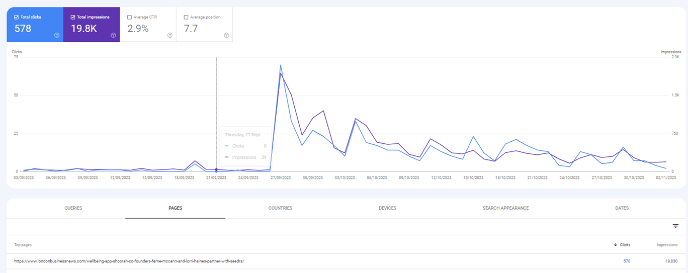 以下统计数据显示,该媒体发布后立即在 Google 上排名靠前,第一周内浏览量就超过 2000 次。 它继续在“shoorah app”、创始人姓名和其他相关搜索词等搜索词上排名,帮助该品牌获得更广泛的引用,从而获得更多的曝光度和可信度。