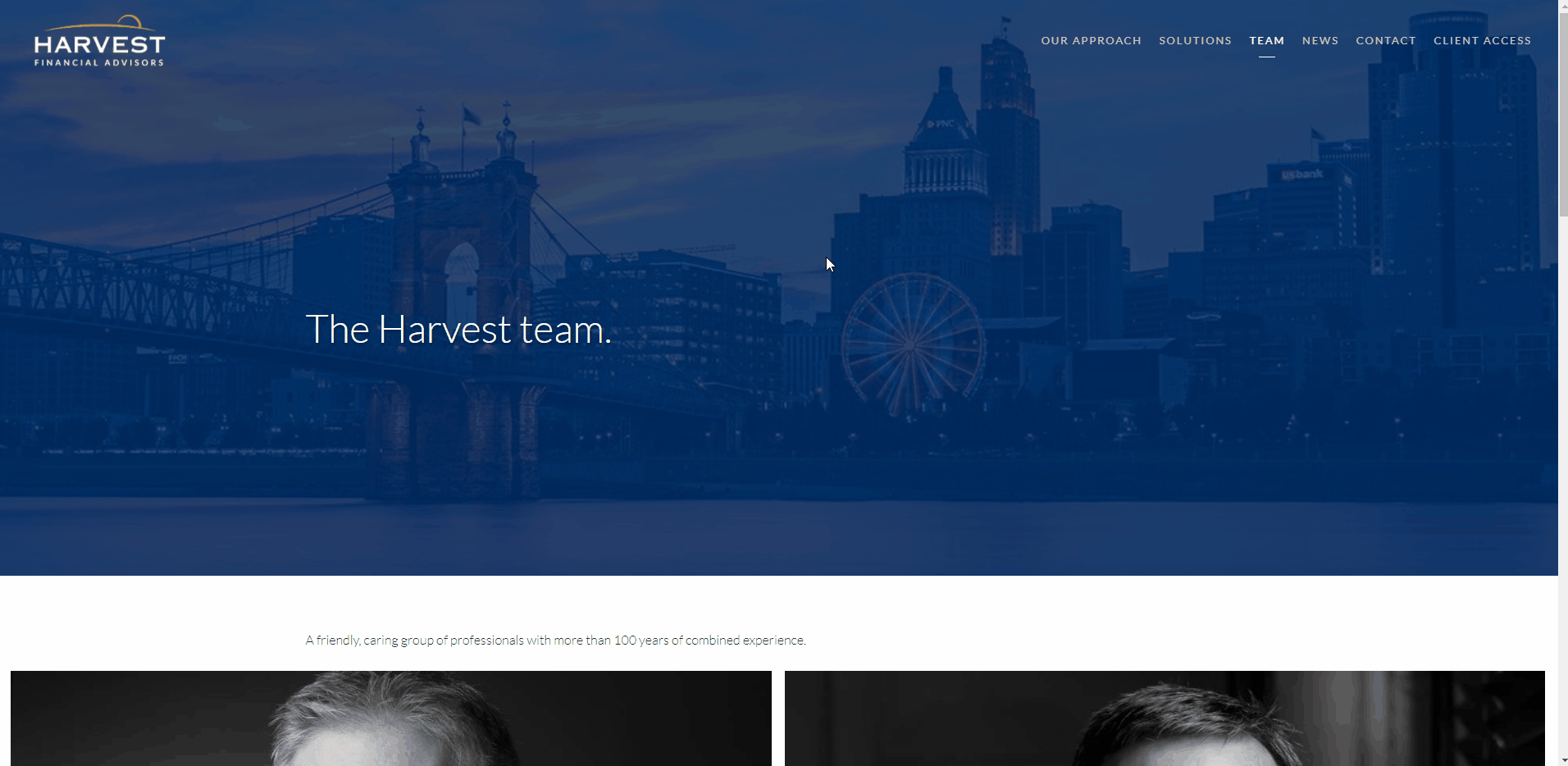 Harvest Financial Advisors 团队页面强调专业性之前的联系。 在记录每个人的个人信息之前,每份简历都会突出个人成就。 通过这种方式,团队页面与家族办公室的价值观相呼应,同时使该办公室的成员更加相关和值得信赖。