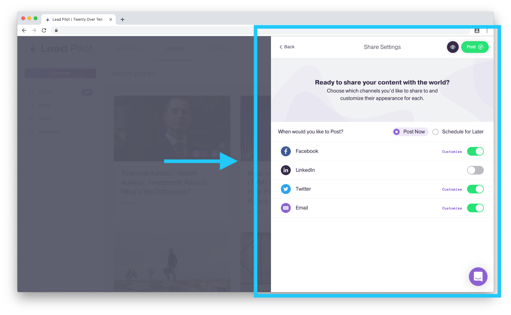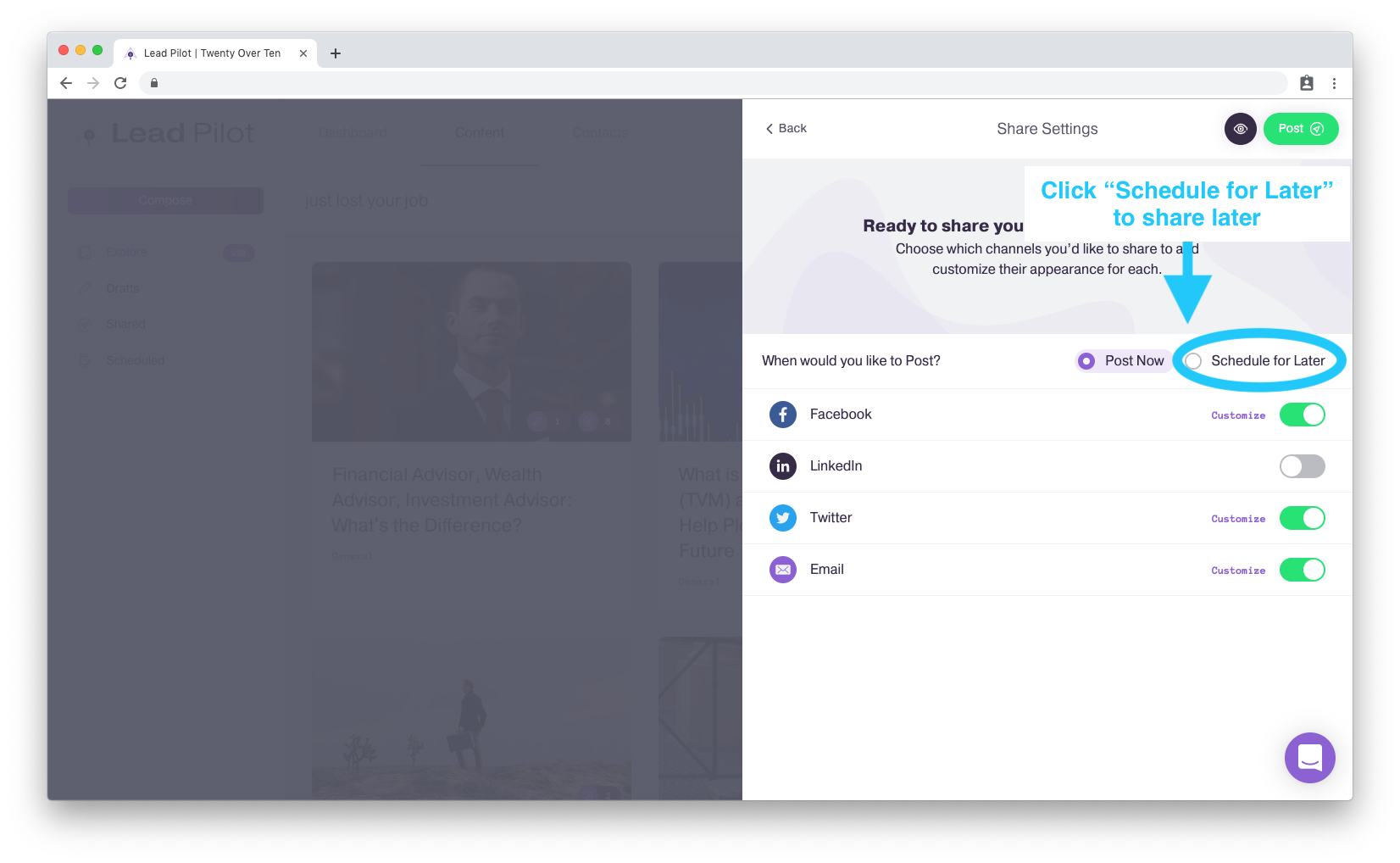 1. 完成创建帖子或从我们的“探索内容库”中选择内容后 要自定义,请单击“编辑草稿”或“预览内容”侧窗口顶部的“共享”按钮: