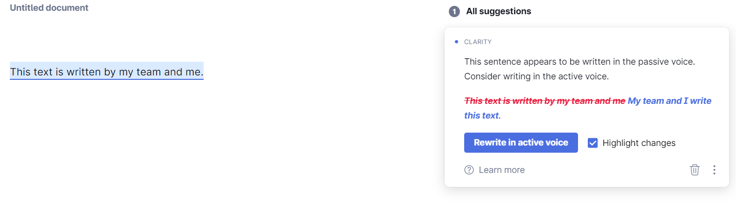 你用被动语态写一个句子。 然后,在右侧, Grammarly给你一个建议,用主动语态重写它。