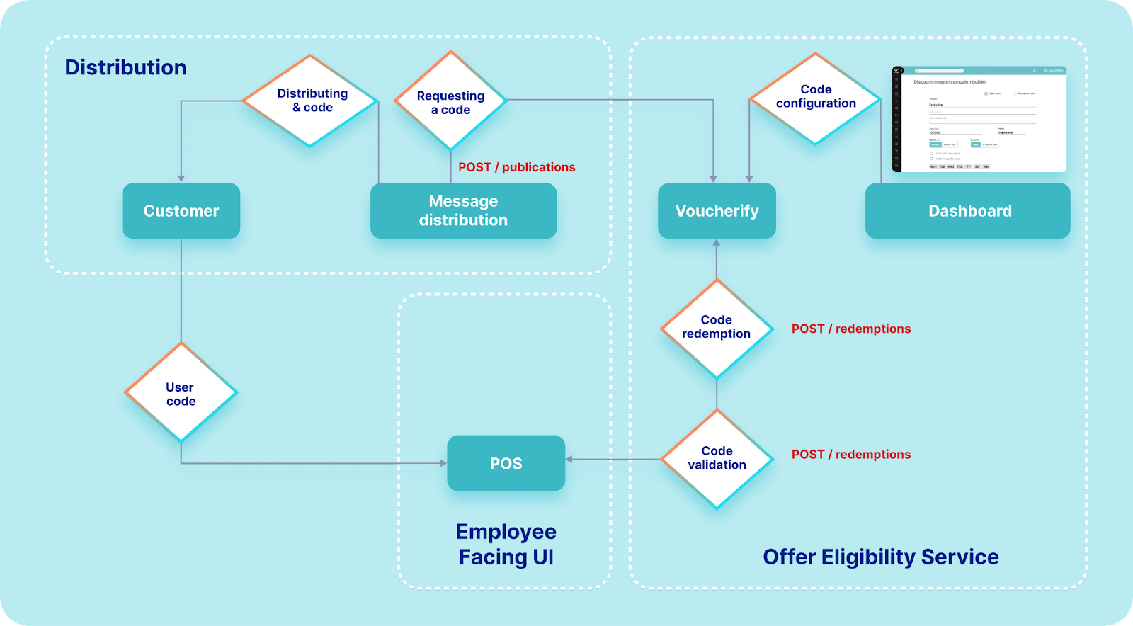 通过将Voucherify链接到您的 POS 系统,您可以增强奖励兑换流程,并通过保证客户获得最佳的全渠道体验来提高客户满意度。 选择 API 集成可提供最大的灵活性,使您能够定制 Voucherify 与 POS 系统的交互方式。 这种方法非常适合内部构建的 POS 系统和可以连接到第三方 API 的系统,确保适应性和定制性。