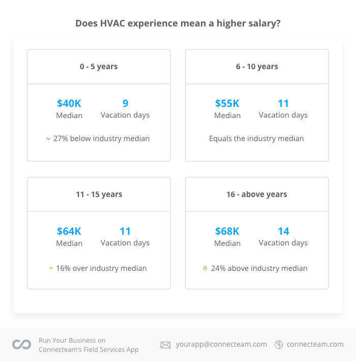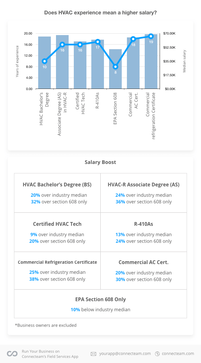 - 可能比任何其他住宅服务业务 HVAC-R 都越来越受技术驱动。 随着新技术的引入,实践经验可能不像过去那样有价值。 相反,教育和证书对薪水的影响最大,根据证书的不同,薪水涨幅从 20% 到 40% 不等。