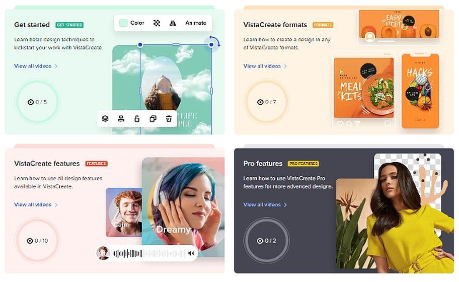 对于那些不熟悉设计过程或想要获得灵感的人,VistaCreate 提供免费教程供用户熟悉可用的功能和工具。