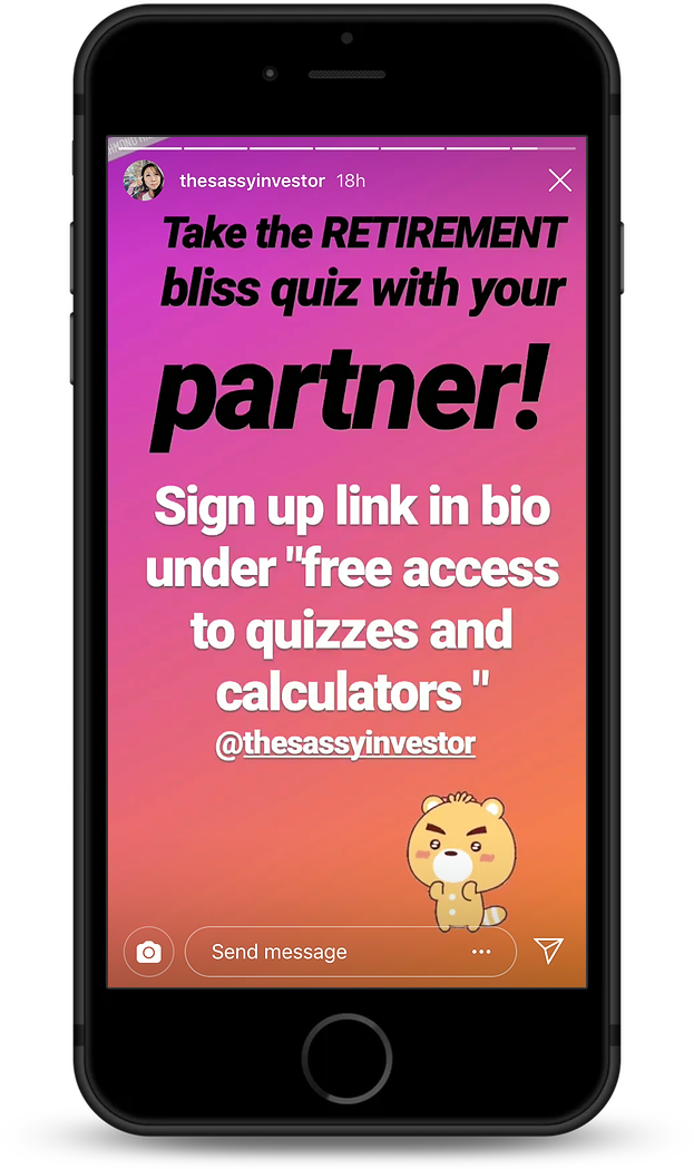 上面的例子来自 Michelle Hung,她在她的故事中宣传了她的退休幸福测验。 她鼓励她的追随者通过她的简历中的链接注册参加测验。