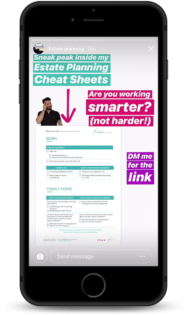 上面来自 Tara Lucke 在 Instagram 上的示例,她使用了她的遗产规划清单的图像、GIF 和带有 CTA 的大胆颜色,真正吸引了她的追随者注意采取行动。