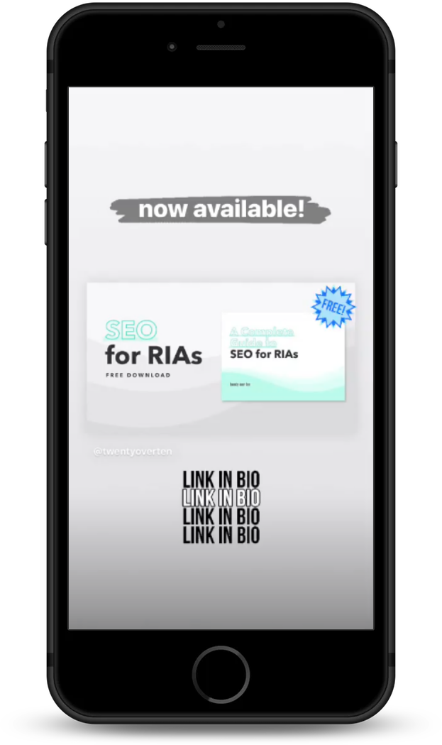 创造一种紧迫感并确保他们理解它只会再提供一点时间,这将使您的观众更有可能“向上滑动”或“链接到生物”。 在上图中,20 Over Ten 正在为关注者提供免费的 RIA SEO 指南。 将 Free 融入任何事物中,并使其看起来对时间敏感,这是获得更多参与度的好方法。