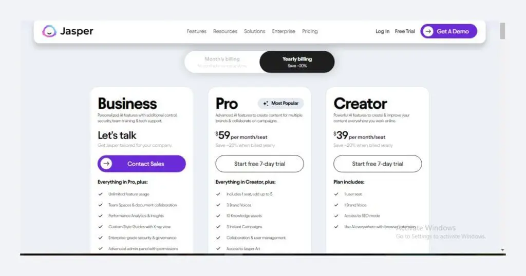 - Jasper AI 提供三种定价计划 - Creator、Pro 和 Business