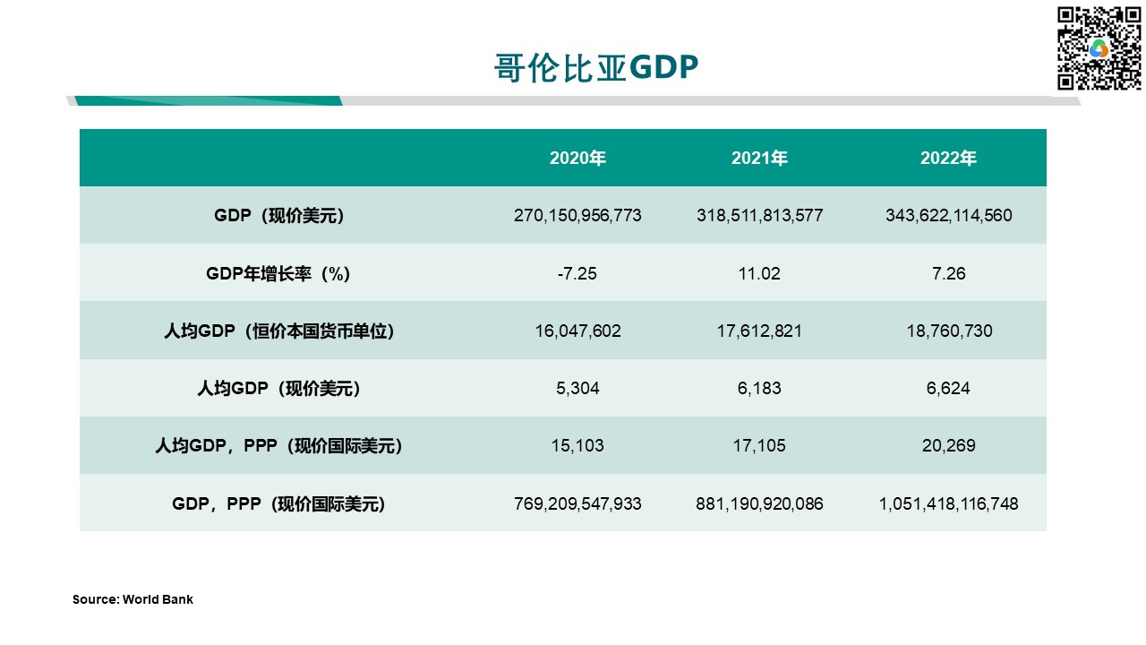 根据世界银行的官方数据,哥伦比亚在2022年的国内生产总值(GDP)为343.62亿美元,占世界经济的0.15%。哥伦比亚的人均GDP为6842.53美元,而按购买力平价(PPP)计算的人均GDP为15616.75美元。