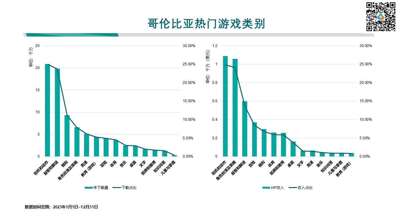 - 街机和动作类游戏的总收入增长了 4.88%,显示此类游戏在哥伦比亚依然受欢迎。