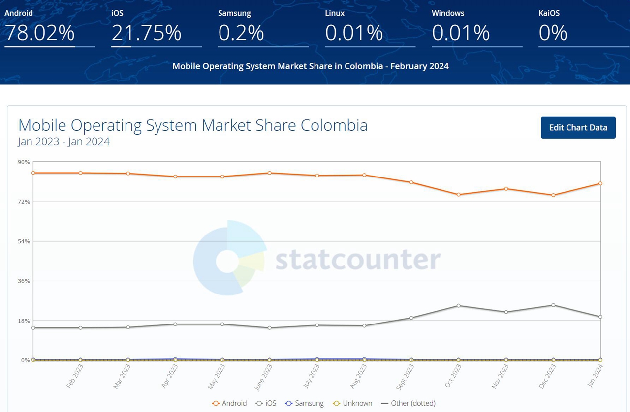 哥伦比亚的移动操作系统市场主要由Android和iOS关注,其中Android占了78.02%,iOS则占了21.75%。其他如三星和Windows的市场份额极小,分别为0.2%和0.01%。