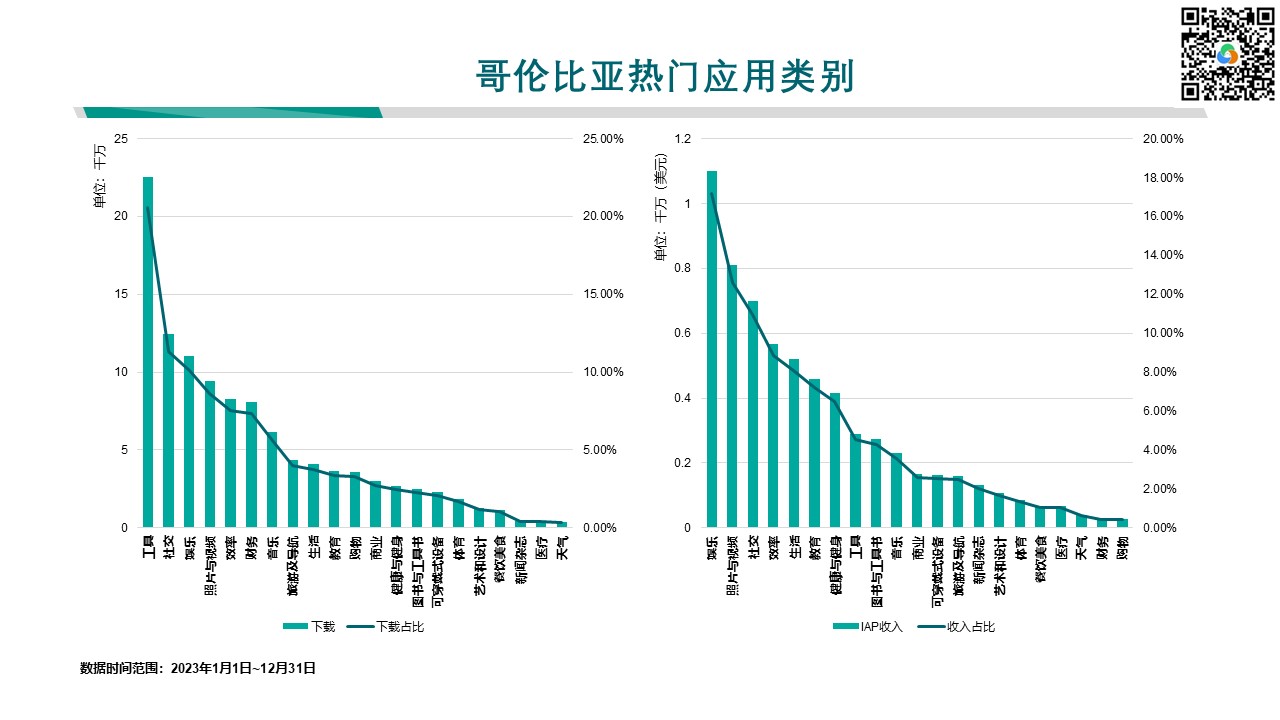 - 效率类应用的下载量增长显着,将为23.18%,同时总收入也同步飙升46.12%,显示哥伦比亚用户对提升工作与生活效率的移动解决方案存在强烈需求。