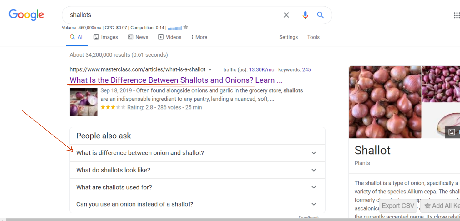 搜索词“shallots”的所有排名靠前的页面都在谈论青葱和洋葱之间的关系。 显然,人们对青葱感到困惑,并正在寻求一些澄清。