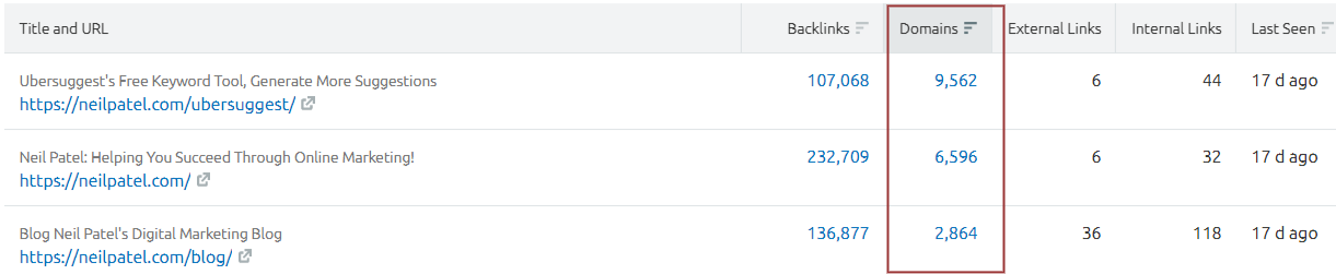 以 Neil Patel 的博客为例。 引用域数量最多的 URL 是他的关键词研究工具 Ubersuggest。