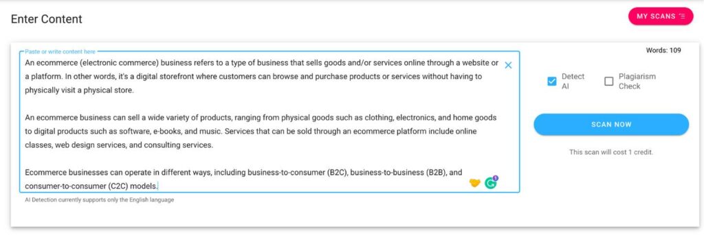 如果您想要 AI 内容检测扫描,请单击检测 AI,它还会要求您将内容粘贴到文本区域。