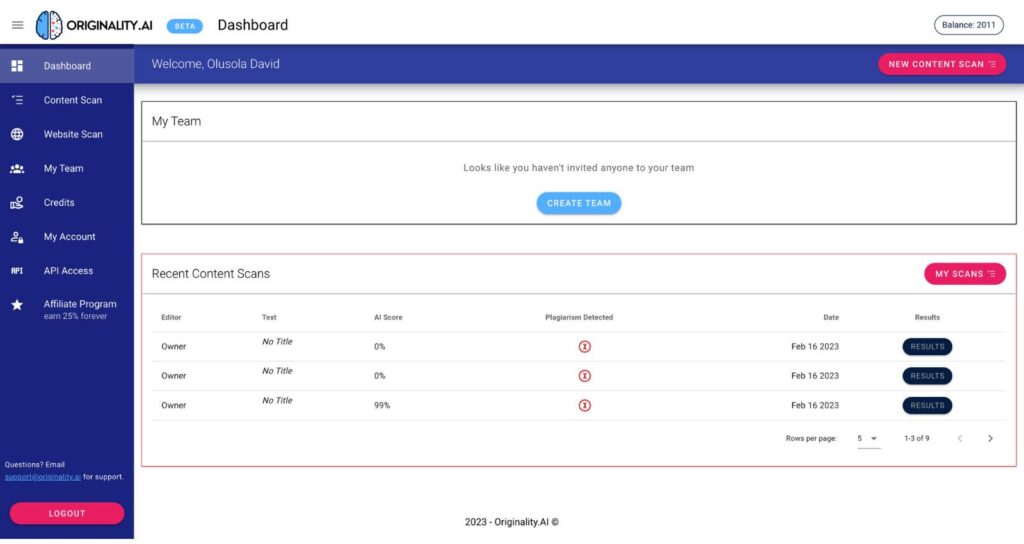 如果您是内容编辑者,这应该是您的首选编辑工具之一。 借助 Originality AI,您可以检查其他团队作者的内容是否存在抄袭。