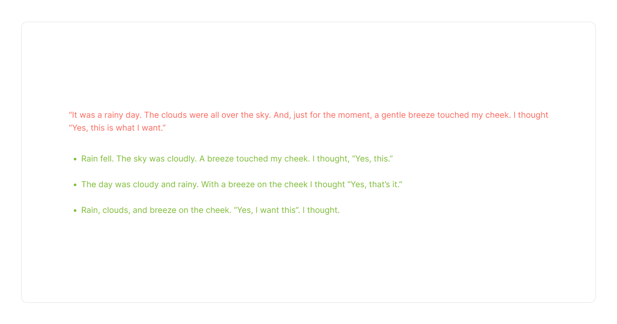 - 创建一个讲故事的概要——仅仅列出关键要素是不够的。 取而代之的是,使用讲故事的技巧将主要内容转换为原始文本的引人入胜但简短的版本。