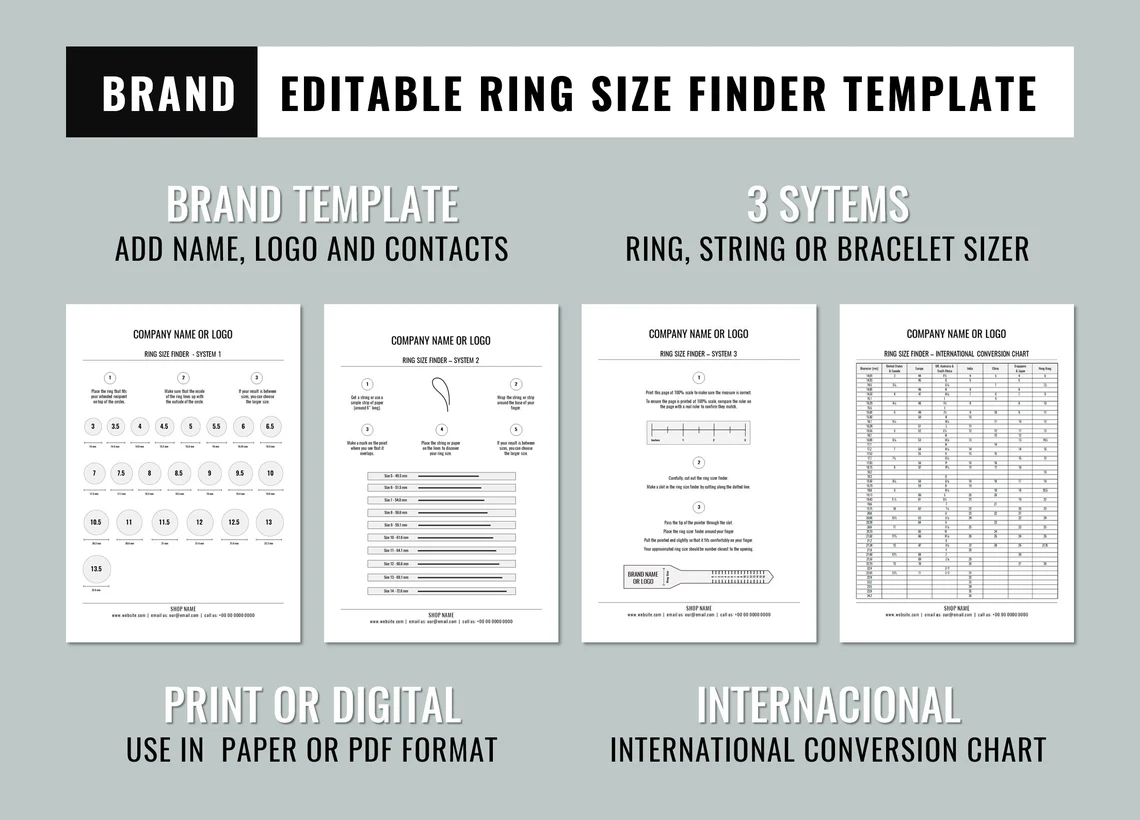 寻找可在线打印的一体式戒指尺寸? 以上从 Poster Set Design 下载的内容包含一个可编辑的戒指尺寸查找器模板,包括三个戒指尺寸系统、一个品牌模板,甚至还有一个尺寸转换表。