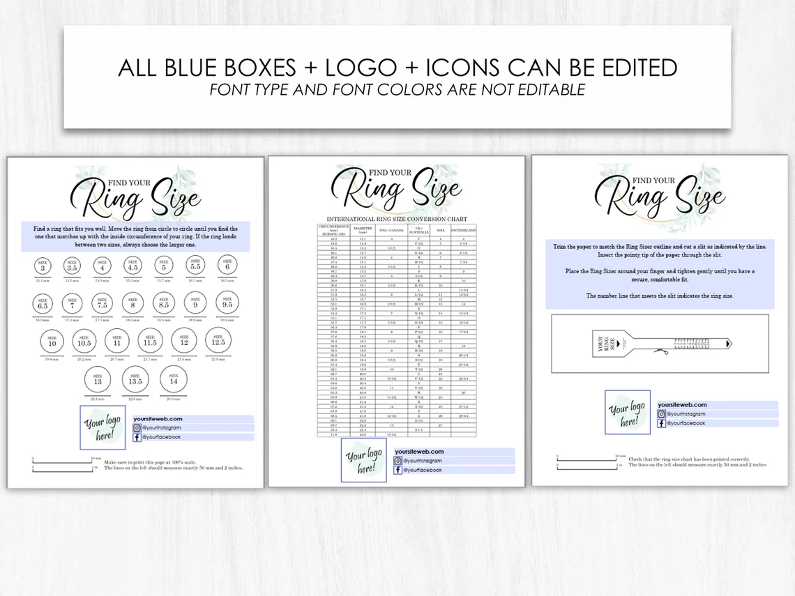 在 Etsy 出售的 JL Ring Designs 的可打印戒指尺寸器具有一条带状的纸条,可以剪下并缠绕在手指上以测量戒指尺寸。 数字下载还具有传统的戒指尺寸表,并且可以为您的业务个性化实际的可打印戒指尺寸。