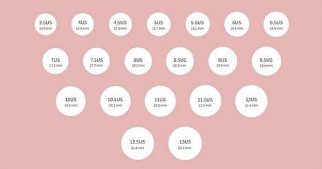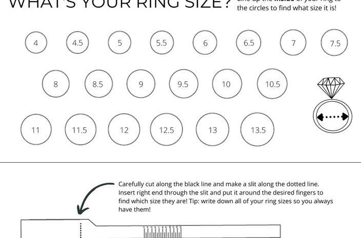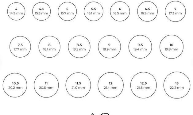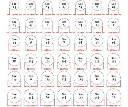 - 戒指尺寸表——传统的戒指尺寸表由一系列圆圈组成,大小从最小到最大不等。 每个圆圈代表一个戒指尺寸甚至一半尺寸。 只需将现有戒指与图表上相同尺寸的圆圈对齐,即可确定适合订婚戒指、结婚戒指或任何其他新戒指的完美戒指尺寸。