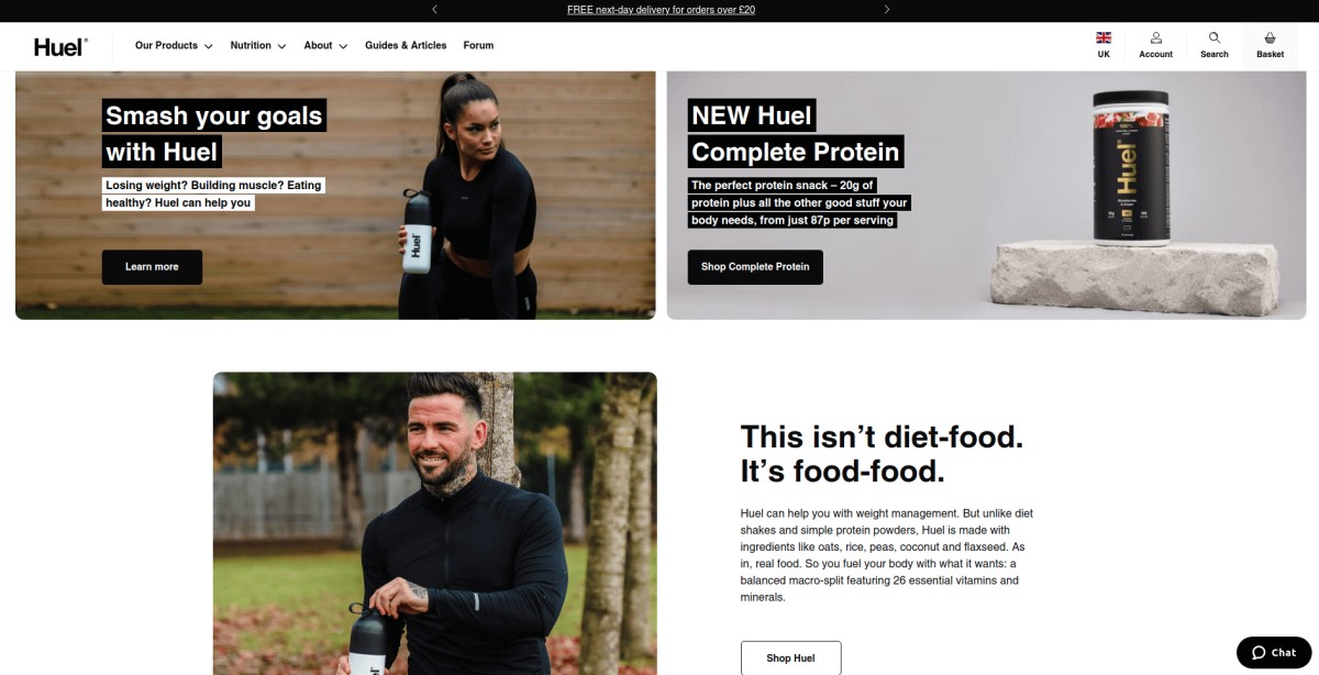 Huel(人類燃料)於 2015 年推出,2021 年是英國最大的成功案例之一。 它提供營養全面的食品——從最初以粉末形式開始,該品牌已將其產品組合擴展到熱食、小吃店、預混合飲料等,並不斷發展壯大。 它使用 Shopify 平台向越來越多的地區的客戶提供營養豐富的產品,展示了該平台的可擴展性以及它如何能夠毫無問題地應對大量訂單。 它是最受歡迎的 Shopify 商店之一,擁有可愛的極簡主義美學。 一家很棒的 Shoify 商店。