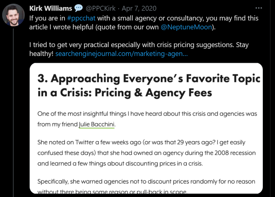 我們相信 Benu 和她的團隊明智地優先考慮長期幫助他們的客戶,即使他們近期支付賬單的能力存在不確定性。 每個人都感受到危機帶來的痛苦,盡你所能加強與客戶的關係,一旦事情恢復正常,他們就會重視與你的代理機構的合作關係。