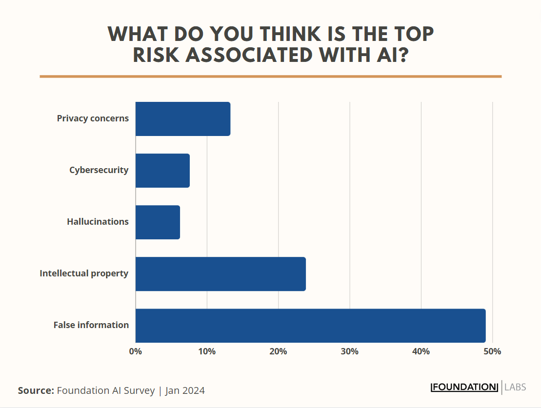 人們廣泛報導了人工智慧產生的錯誤訊息可能對從選舉到危機管理等各個方面產生的影響。 鑑於如此多的關注,近一半的受訪者將虛假資訊視為與人工智慧相關的最大風險也就不足為奇了。