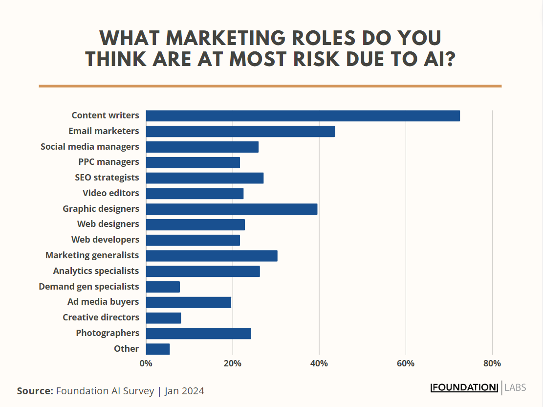 文字到圖像生成工具的流行是影響我們結果的另一個主要因素。 近40%的受訪者認為平面設計師是將外包給人工智慧的行銷角色。 考慮到使用DALL-E和Midjourney提示創建視覺資產是多麼容易,這並不奇怪。