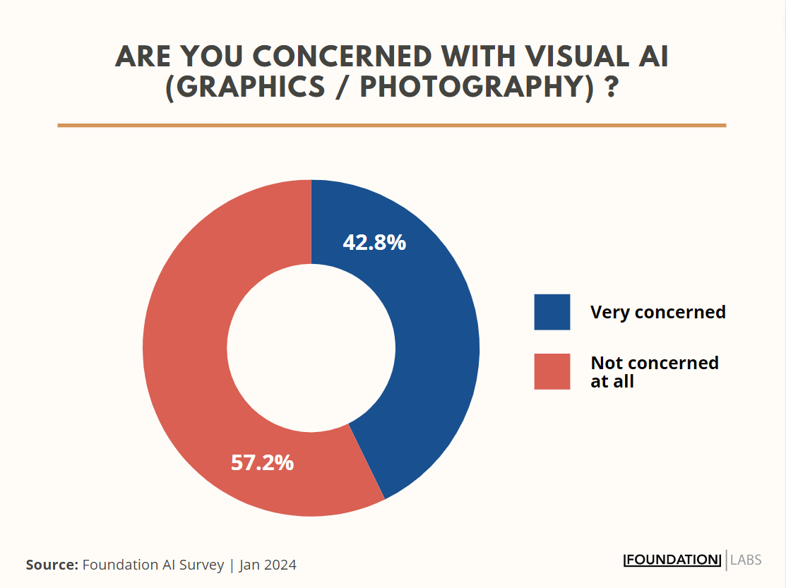 我們也詢問了受訪者對視覺和視訊人工智慧創作工具的日益使用的擔憂程度。 略多於受訪者( 57% )表示不擔心。