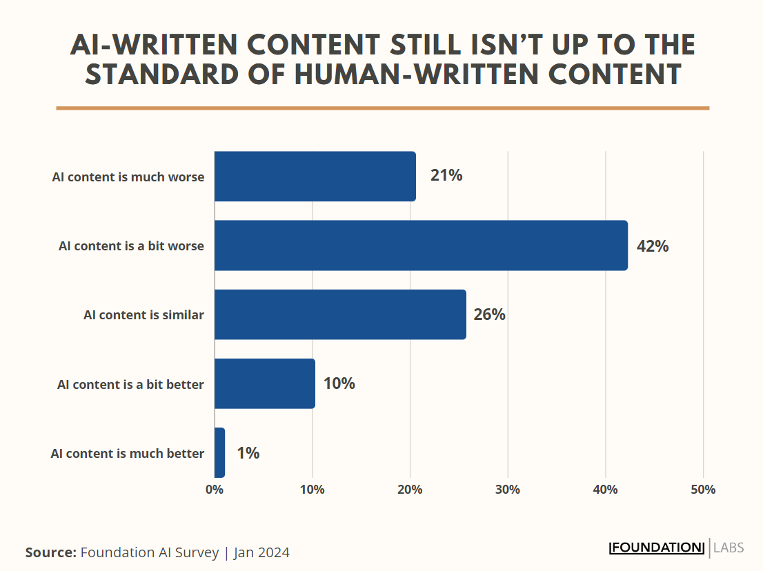 有趣的是,大約四分之一的受訪者認為 ChatGPT、Jasper 和其他生成工具的內容與行銷人員創建的內容相似。 這可能是一個沒有以正確的方式使用人工智慧的問題,看看這種觀點如何隨著技術本身的發展而發展將會很有趣。