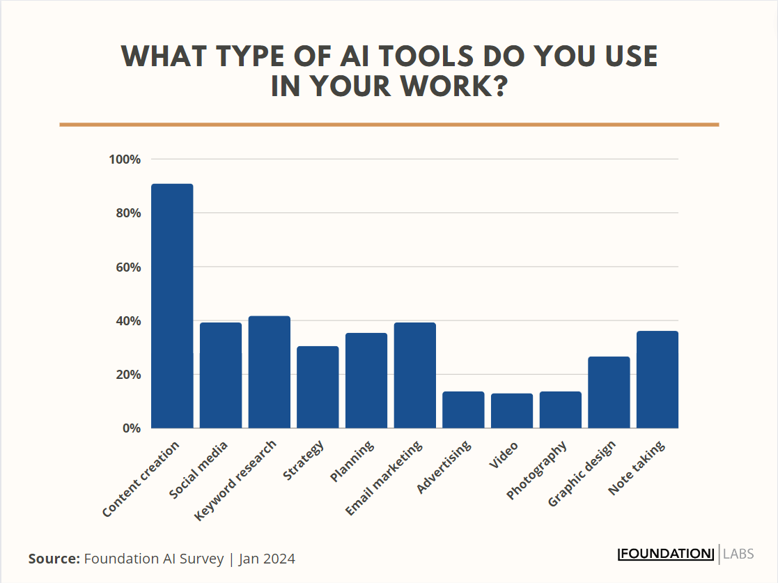 在我們的行銷受訪者中,第二受歡迎的人工智慧應用是關鍵字研究(42%)、社群媒體(39%)、電子郵件行銷(39%)和筆記(36%)。