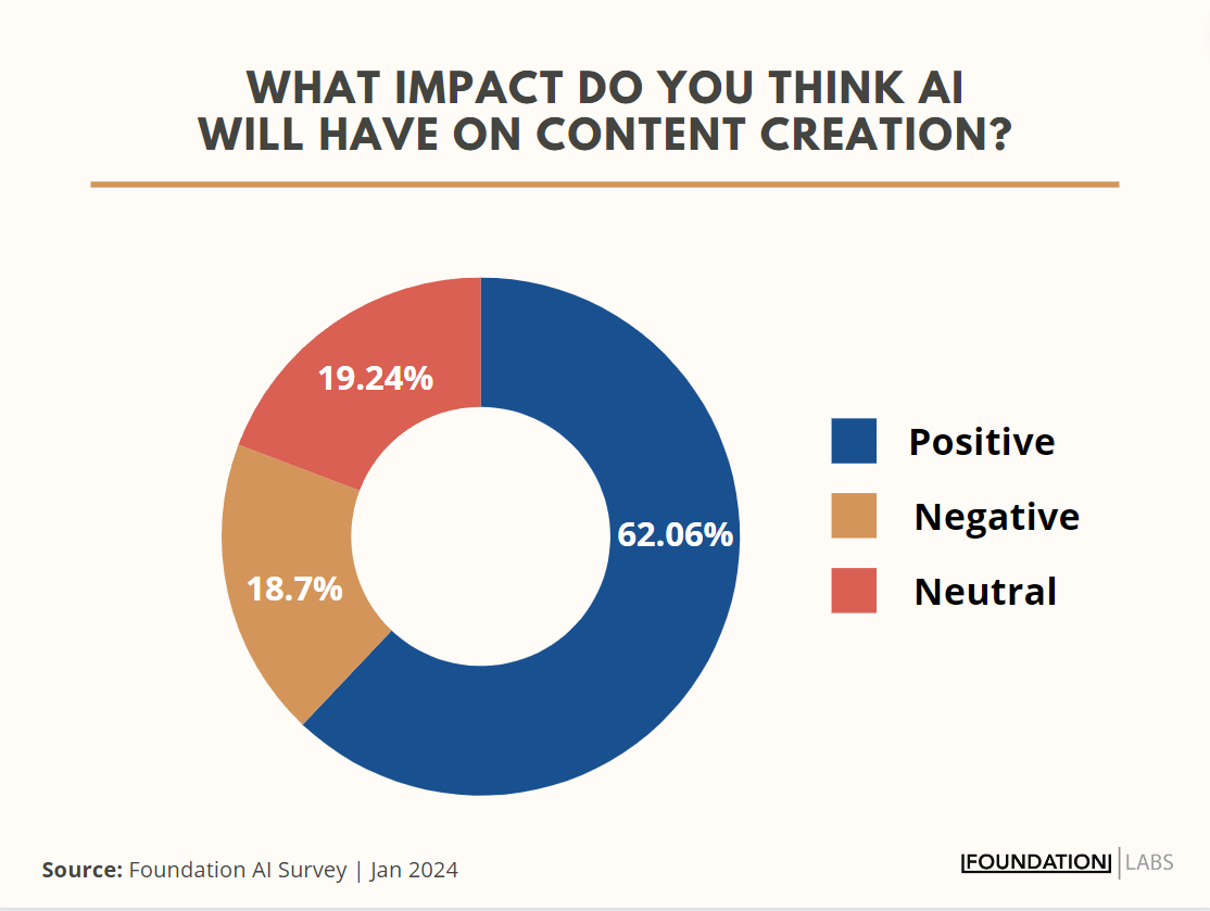 就人工智慧對內容的影響而言,行銷人員大多持樂觀態度。 在我們的受訪者中,有 62%的人認為 ChatGPT 和 Jasper 等工具在長期內將提高內容品質。產生想法、增強語言和自動化日常任務是該技術幫助行銷人員在更短的時間內創建更好的內容的一些方式。 人工智慧正在成為一種增強力量,提高創造力和效率。