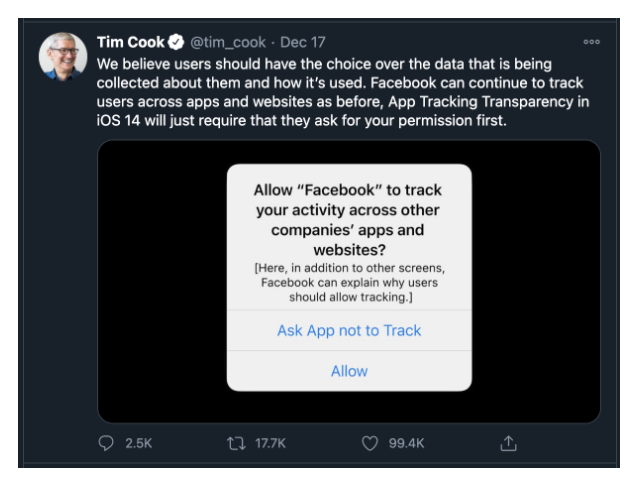 主要變化是引入了 Apple 的 App Tracking Transparency (ATT) 框架,該框架將展示各種應用程序使用的數據,並要求用戶“選擇加入”在 iOS 14 設備上進行跟踪。