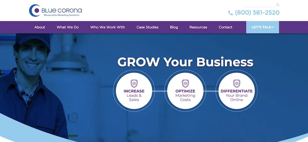 Blue Corona 的綜合服務產品列表可以幫助家庭服務企業在搜索引擎中攀升到更高的位置。 他們提供頁內和頁外優化、內容創建、網站架構、設計、開發等。