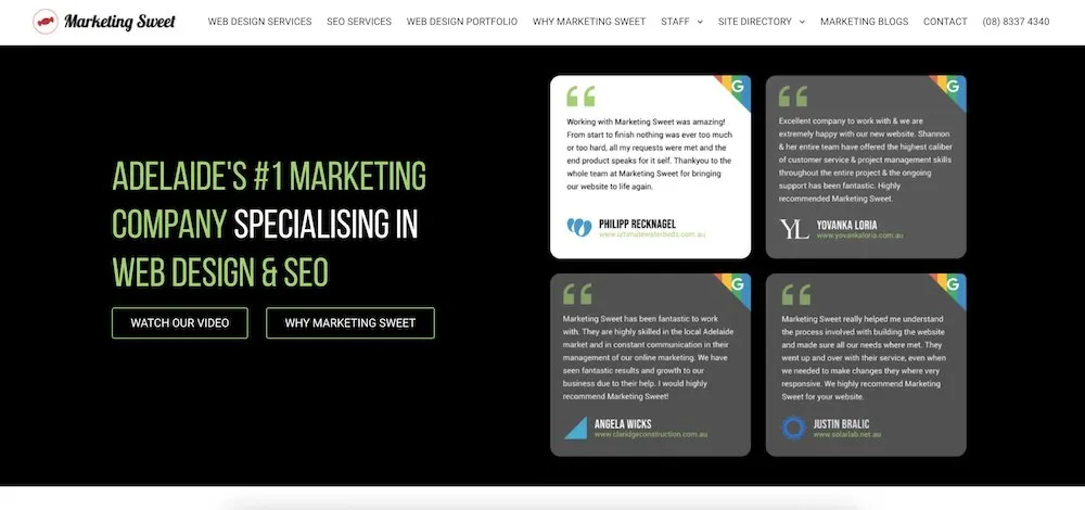 Marketing Sweet 是澳大利亞最大、最成功的數字營銷公司之一。 他們在全國擁有 70 多名員工和 1500 名客戶,是網頁設計和 SEO 方面的專家。 他們還聲稱擁有業內最好的客戶服務,根據他們收到的 150 多條正面評價,這似乎是準確的,為他們贏得了 4.7 星的 Google 評級。