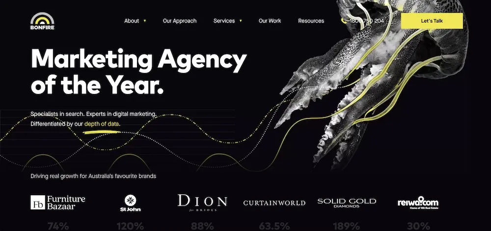Bonfire 的客戶包括一些頂級品牌,例如 Dion、St Johns 和 Furniture Bazaar。 他們的 200 多條 Google 評論和 4.9 星評級證明了他們對提供優質服務的承諾。 憑藉 20 多年的經驗,Bonfire 值得任何尋求高質量 SEO、Google AdWords、數字廣告、再營銷或社交媒體廣告服務的企業考慮。