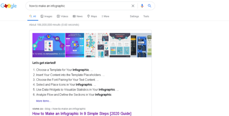 例如,鍵入查詢“如何製作信息圖”並查看 SERP。 您將看到我們的信息圖表設計指南通過包含您需要採取的步驟的特色片段回答了這個問題。
