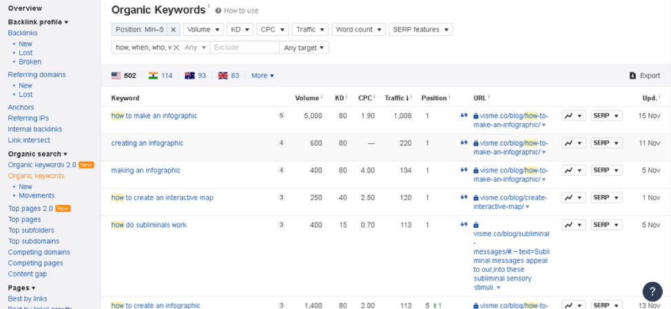 要了解您的網站是否為這些長尾關鍵字排名,您應該查看 Ahrefs 的“有機關鍵字”報告。 只需通過指出位置(前 5 個 SERP 結果)並包括“何時”一詞來過濾結果。 “如何”、“為什麼”等
