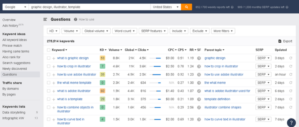 正如您從上面的屏幕截圖中看到的那樣,我設法為我的目標關鍵字“平面設計”、“模板”、“插畫家”探索“問題”機會。 該報告提出了許多問題,其中包括其中一些關鍵字。 做同樣的事情,你會得到相當多的低掛果實。