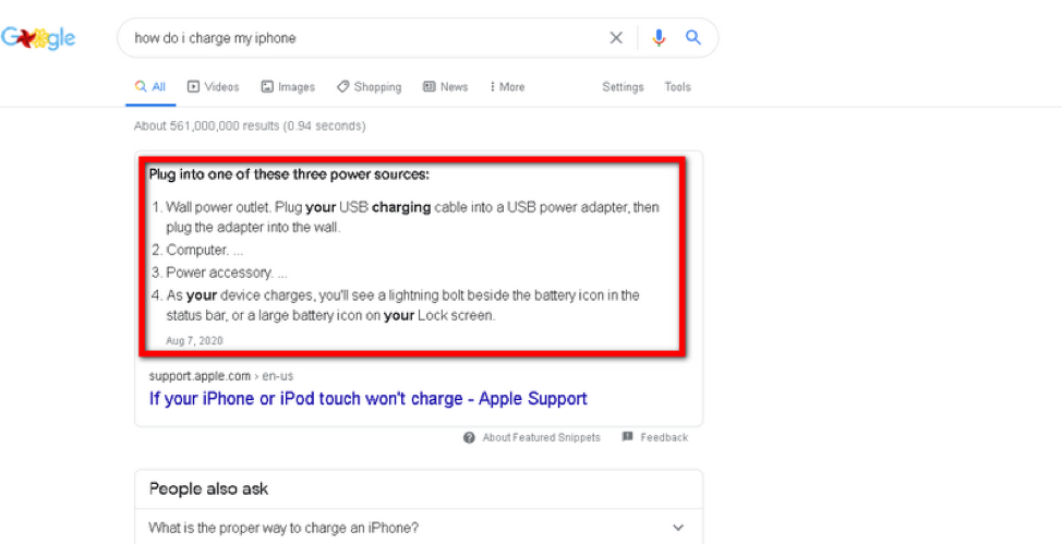 例如,我問谷歌“我如何為我的 iPhone 充電?” 我得到了一個特色片段形式的分步說明。