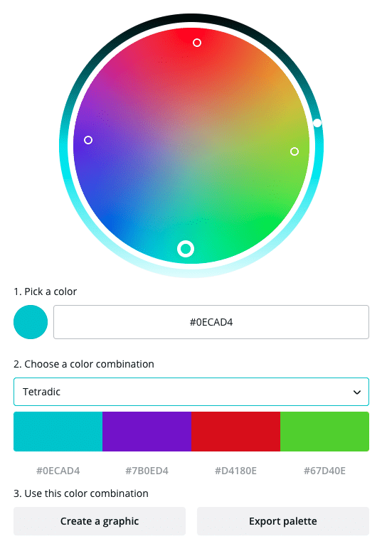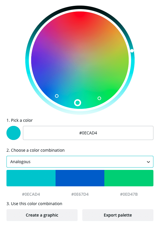 當您在品牌標準的範圍內工作並且需要為新的活動或計劃添加額外的顏色時,Canva 色輪會很有幫助。 這個輪子會根據您嘗試構建的調色板類型找到與客戶現有顏色相輔相成的顏色。