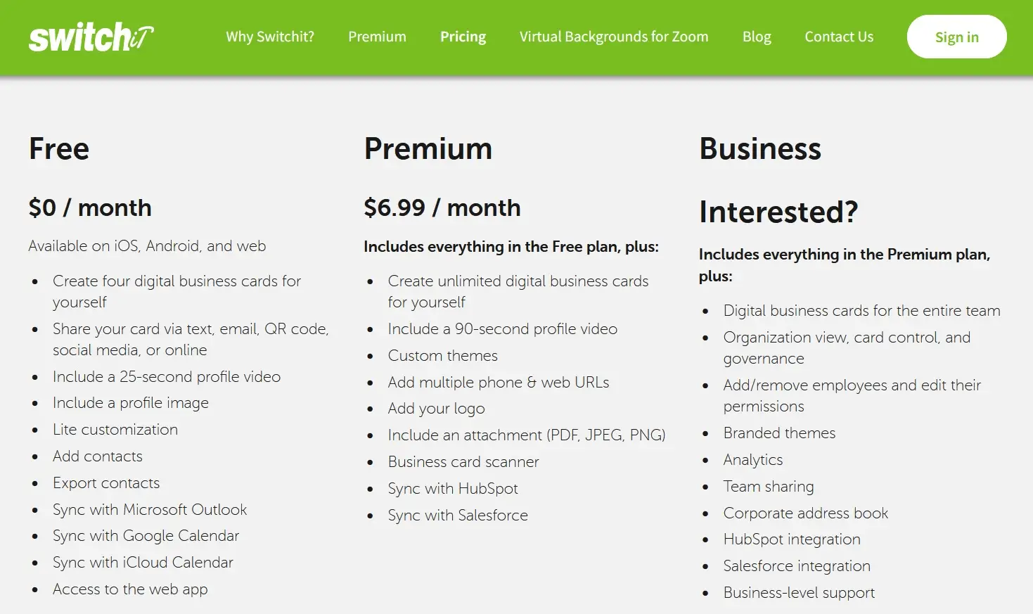 Switchit 的免費計劃不提供您通常期望在數字名片中看到的功能。 因此,您需要選擇付費計劃來設計一張強大的名片。 Swtichit 的高級計劃費用為每月 6.99 美元。