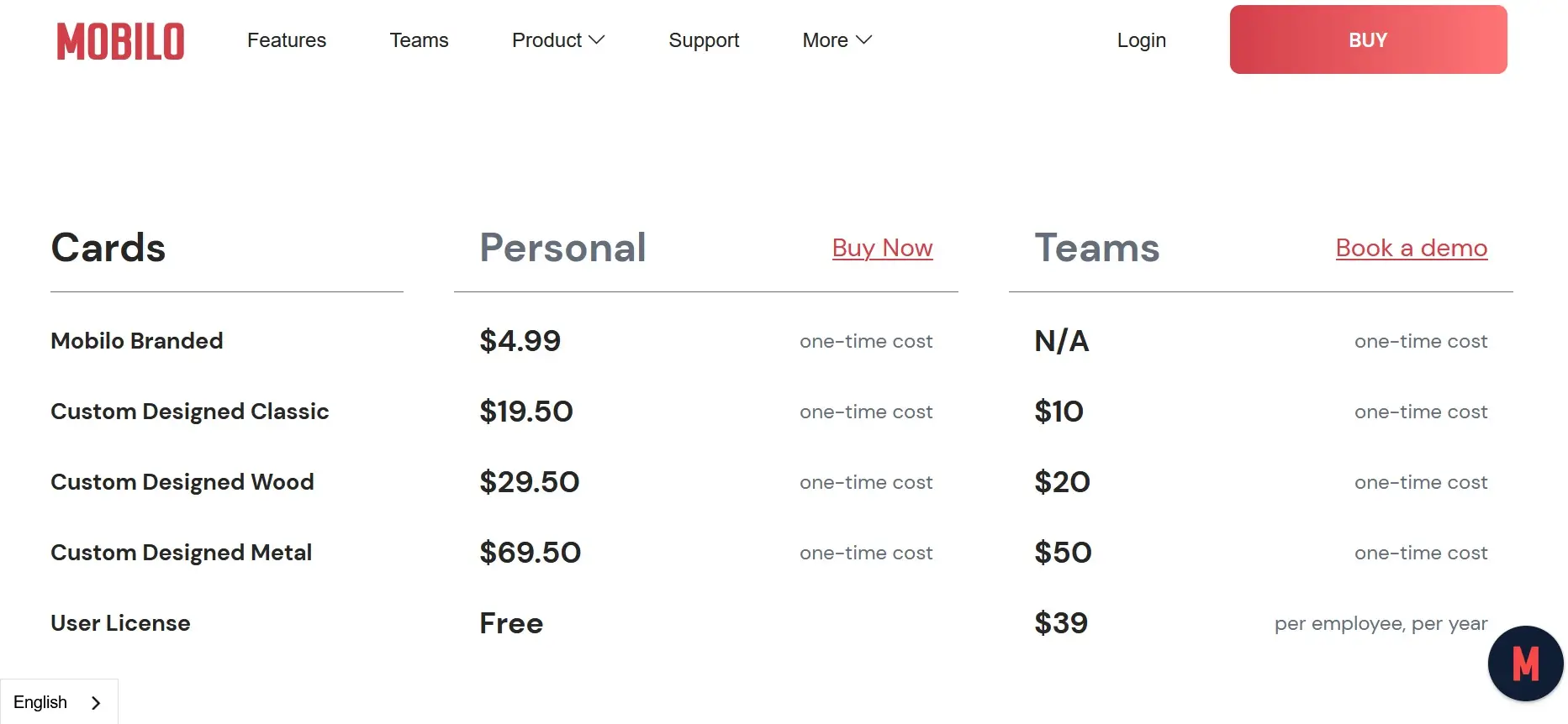 Mobilo 提供由各種材料製成的 NFC 卡。 因此,Mobilo 名片的定價取決於您選擇的名片類型。 Mobilo 數字卡供個人使用的起價為 4.99 美元(一次性費用)。 對於員工團隊來說,定價取決於團隊成員的數量。