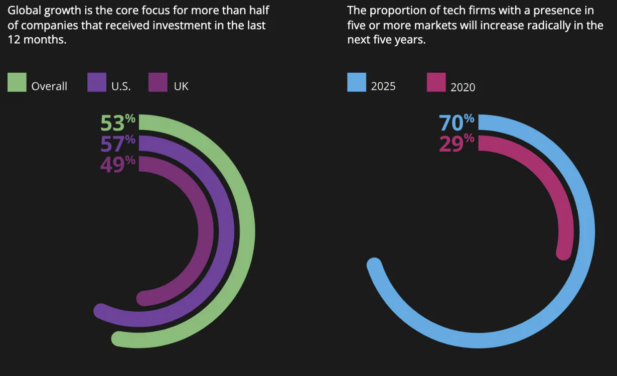 根據 Velocity Global 的數據,全球增長是 2020 年獲得投資的公司中超過一半的核心關注點,特別是 70% 的科技公司計劃到 2025 年在五個或更多國家開展業務。