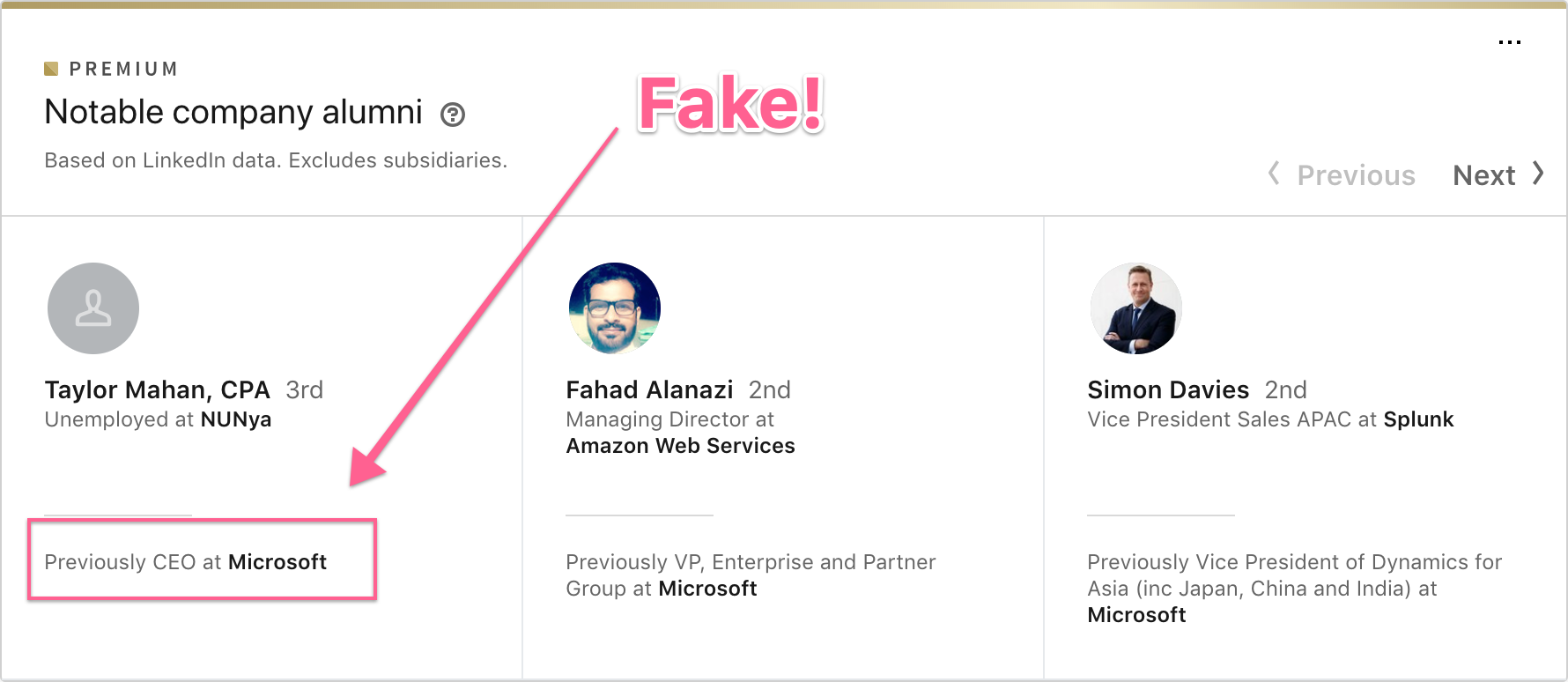 他通過將微軟添加到他的體驗部分並給自己命名為 CEO 來實現這一點。 LinkedIn 可以通過賦予頁面管理員“批准”或“確認”體驗的能力來輕鬆防止這種情況發生。