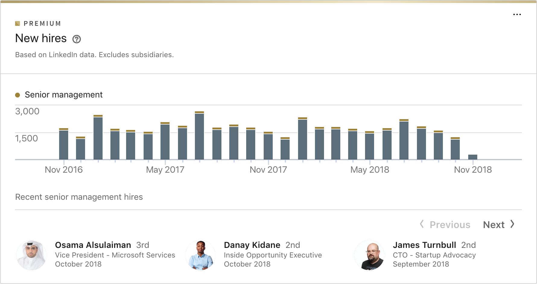 LinkedIn Premium、Sales Navigator 和 Talent Solution 訂閱者可以使用所有這些字段進行高級搜索,例如通過搜索職位為“CMO”、在總部位於“紐約”的“超過 10,001 名員工”類別的公司工作的人”。