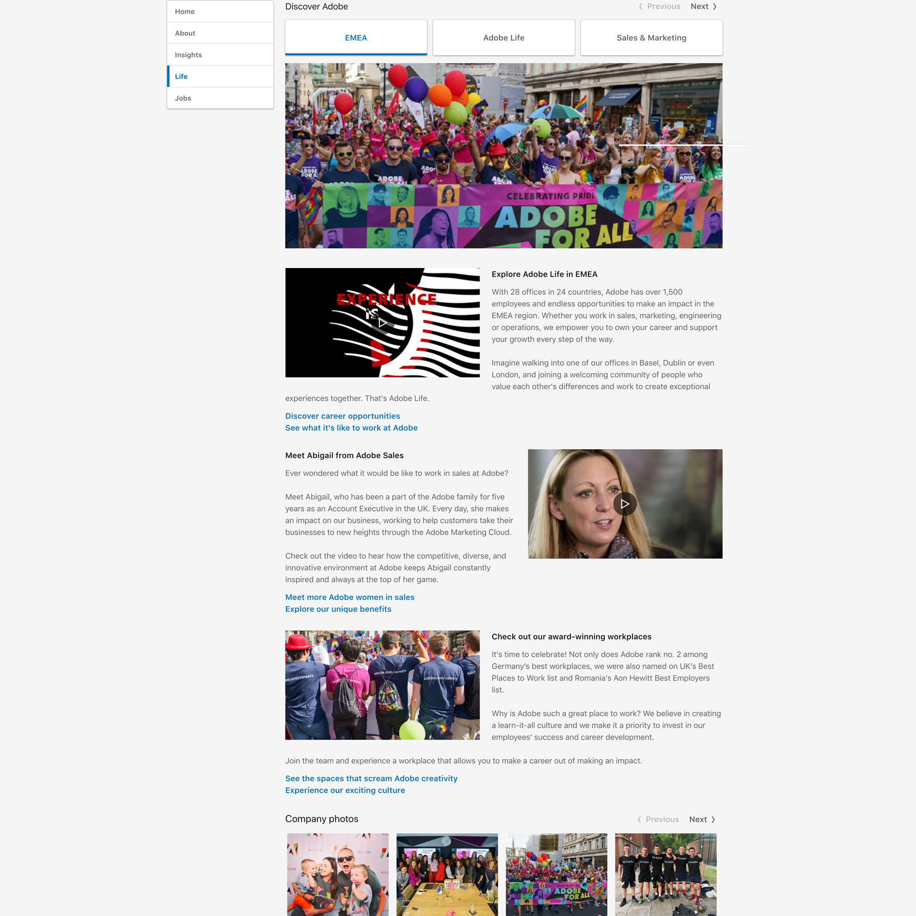 生活部分允許您在公司頁面中創建一個微型站點,其中包含有關您的公司和文化的其他信息。