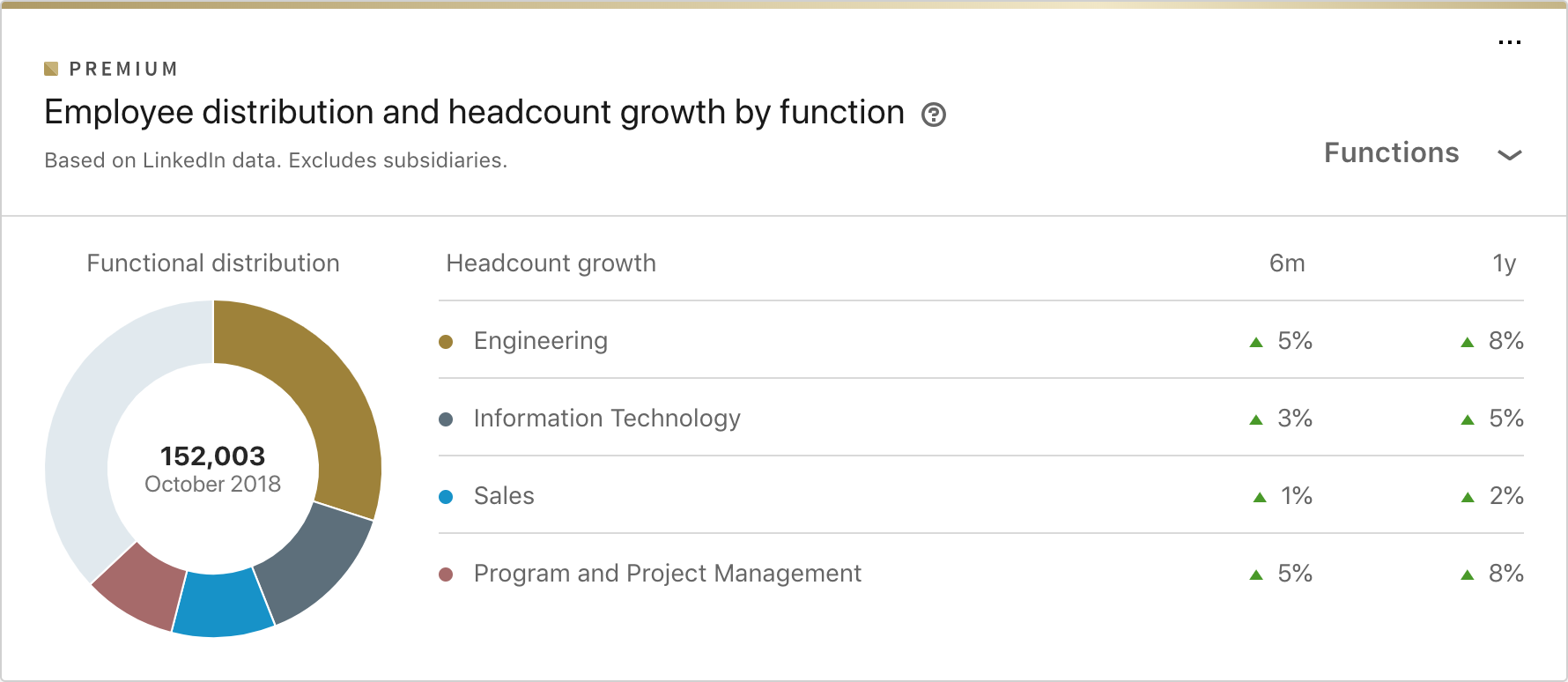 下面來自 Microsoft 洞察選項卡的示例向我們展示了 Microsoft 的工程人員人數增長速度是其銷售團隊的 5 倍。 這可能表明微軟將新產品開發置於銷售之上。