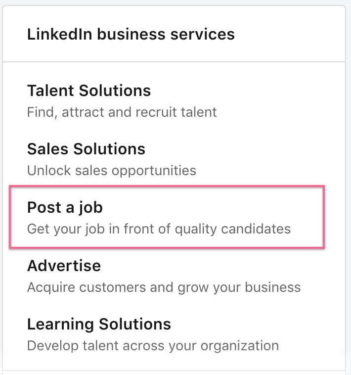 要創建新的工作列表,請單擊 LinkedIn 導航欄右上角的“工作”圖標,然後選擇“發布工作”。