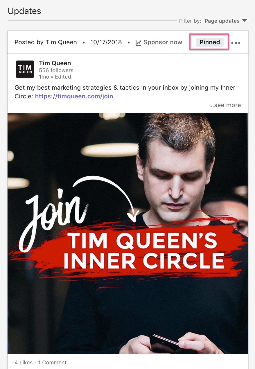 主屏幕上最被低估的功能之一是將帖子固定到頂部的能力。 這是一個很好的示例,說明如何使用固定為您的業務生成潛在客戶: